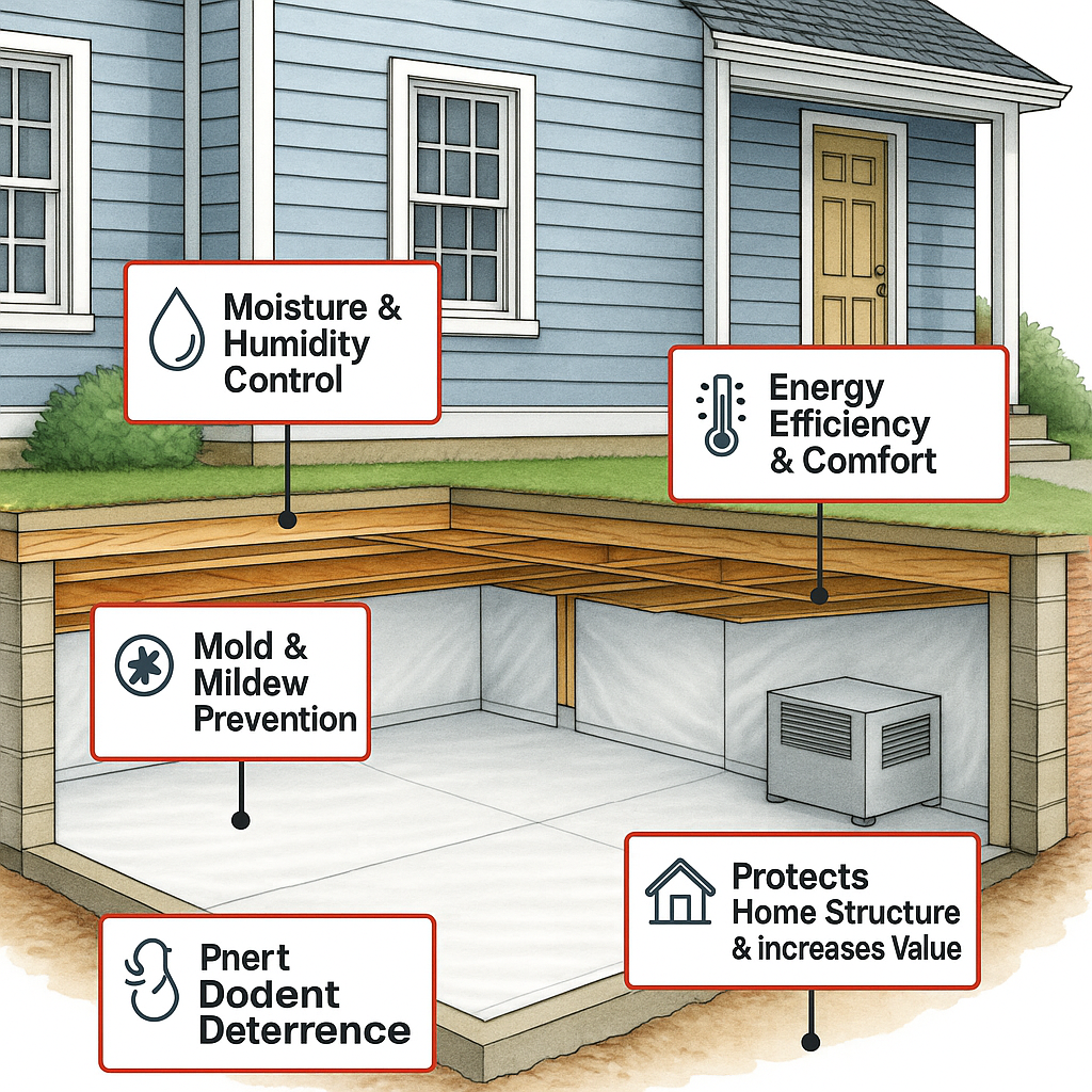 • Crawl Space Drainage: Proper drainage prevents water buildup, further protecting your crawl space from moisture-related damage.